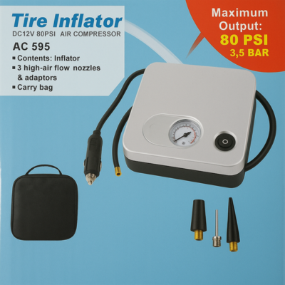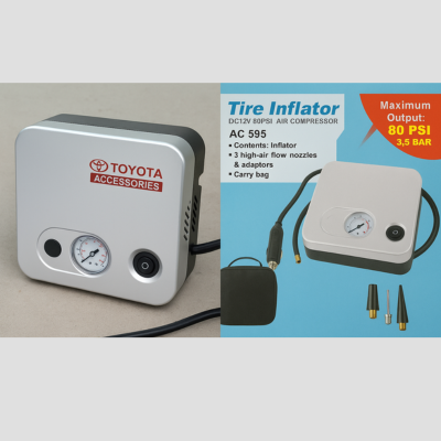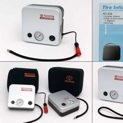 This 12V Double Function Portable Air Compressor is specially designed for Toyota cars. With both inflating and deflating functions, it quickly adjusts tire pressure for safe driving. Built-in pressure gauge ensures accurate readings. Compact, lightweight, and easy to carry with included toolkit, making it perfect for roadside emergencies and travel.